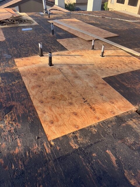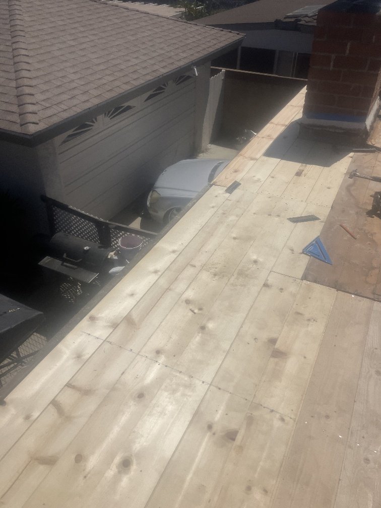 Removed 35 year old wood shake roof in Huntington Beach due to age, termite damage and fire hazard. Replaced termite damaged lumber. Installed 4×8 solid sheeting and 30# underlayment.