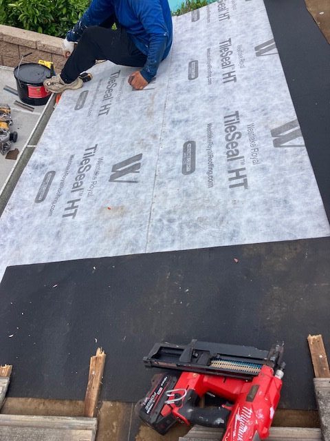 Complete concrete tile roof repair and underlayment replacement, including full tile removal, rafter inspection, structural repairs, and installation of a Westlake Royal TileSeal HT system for superior waterproofing, durability, and long-term protection.
