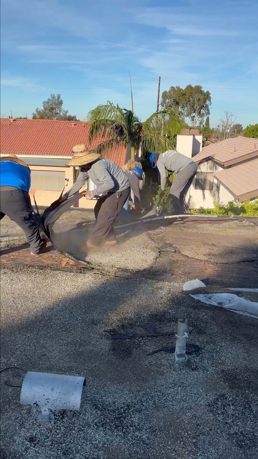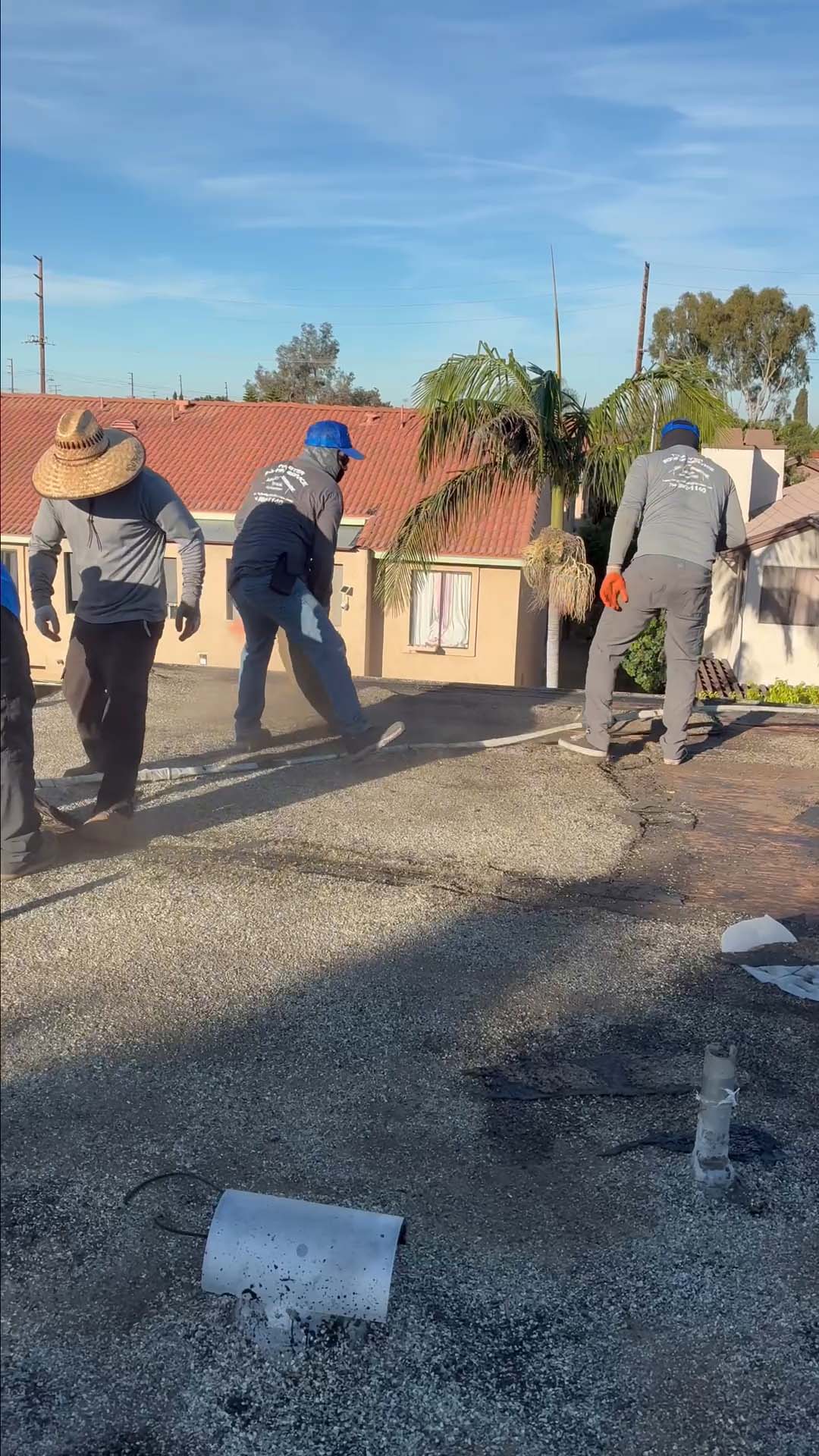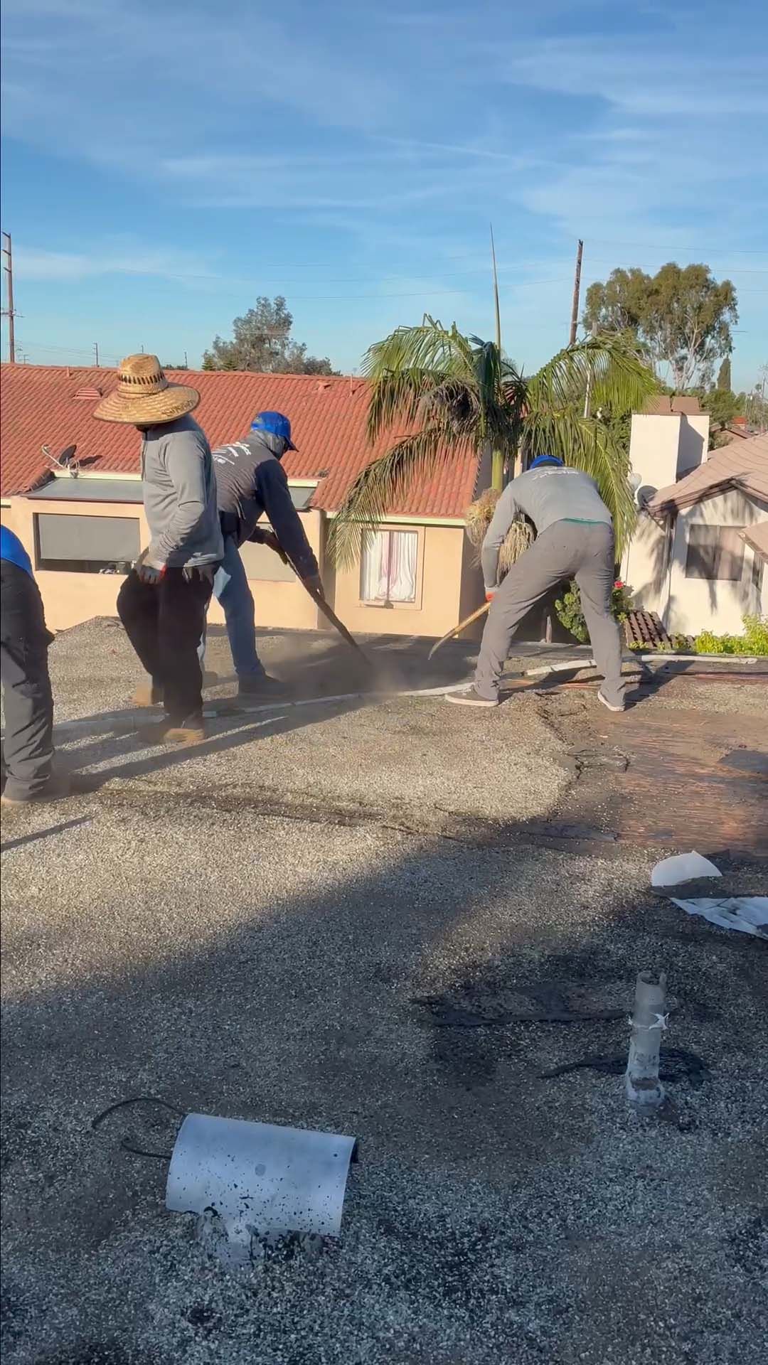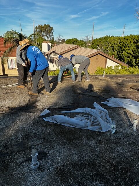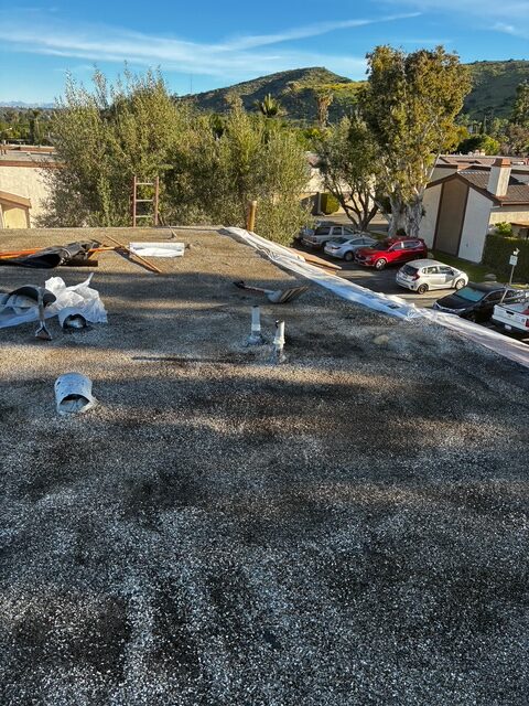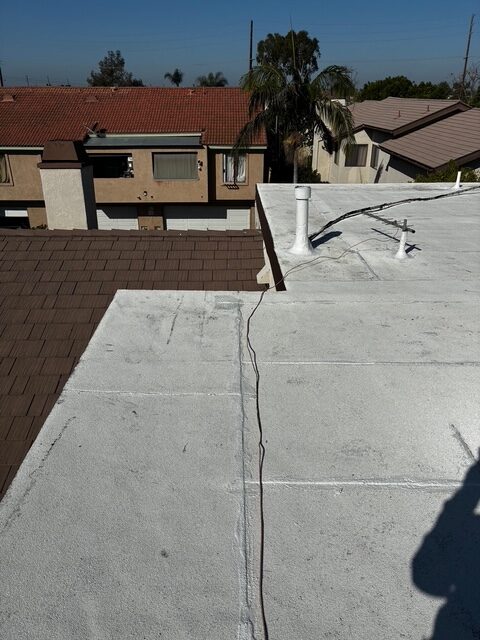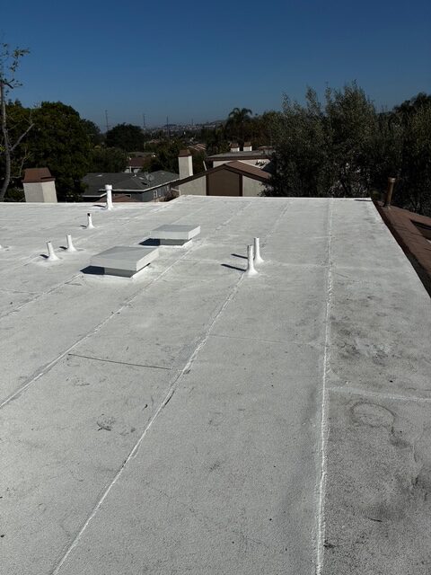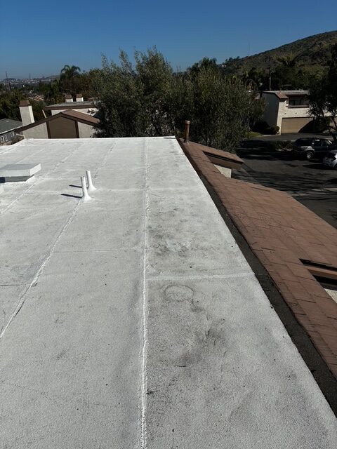 | Project Type Flat Roof Replacement | Scope of Work Full tear-off, deck repair, foam coating with gravel ballast removal | Roof System Title 24 Cool Roof System |