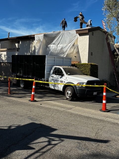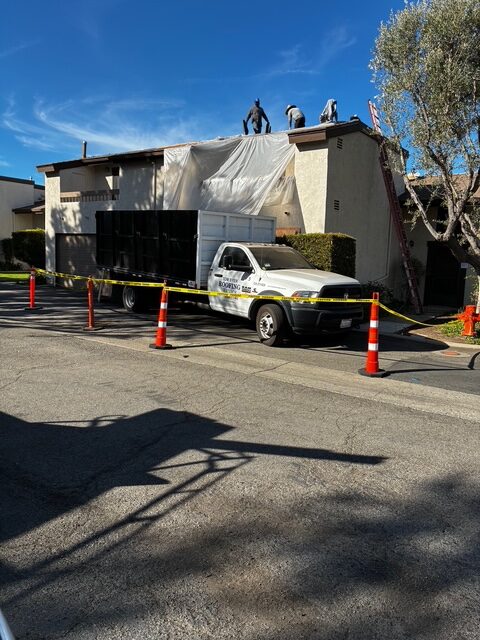 The Tom Byer Roofing team mobilized with a full crew, service truck, and dedicated debris container. Safety cones and caution tape were deployed at street level to protect pedestrians and vehicles. The work area was draped with protective sheeting to contain debris and prevent damage to the building exterior during the tear-off phase.