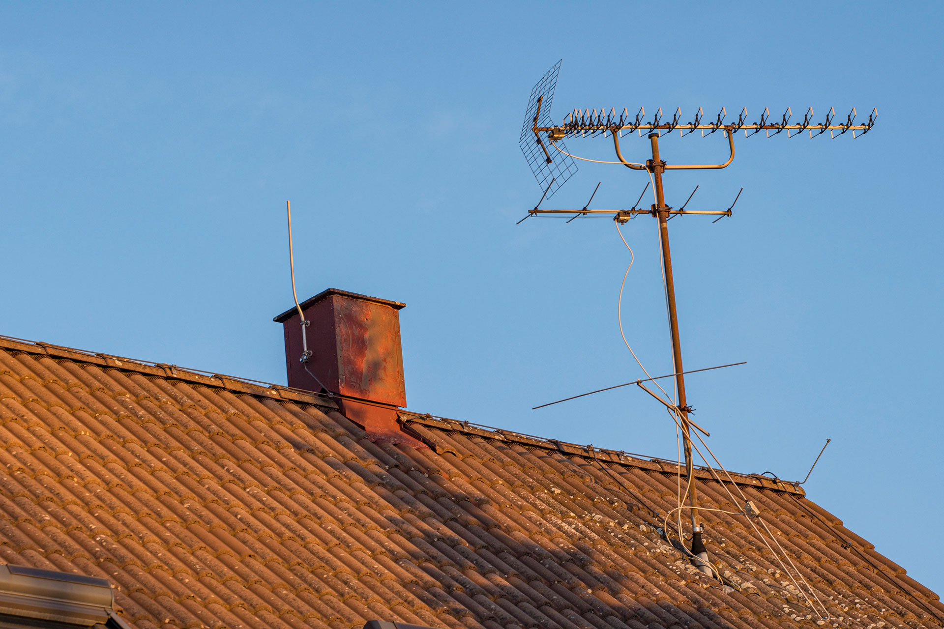 Old antennas are not just an eyesore. They can cause leaks and need to be removed. Many antennas are bolted to the roof, then tethered with wires to keep them upright. If the tethers fail, a strong wind can bend or break the antenna and it can damage roof shingles or tiles. Bolts placed on the roof for the tethers and antenna mounting can deteriorate and should be removed and properly patched to prevent leaks.
